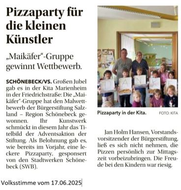 Die Aufregung war groß in der Spatzen-Gruppe der Kita „Kinderoase“ in Schönebeck. Um 10:30 Uhr überbrachte der Vorsitzende der Bürgerstiftung Salzland – Region Schönebeck eine prall gefüllte Tasche mit frischen Pizzen. Die Kinder der Spatzen-Gruppe hatten bei dem Wettbewerb für das Titelbild des diesjährigen Adventskalenders der Bürgerstiftung den ersten Preis gewonnen. Für das Siegermotiv hatte die Bürgerstiftung eine Pizzaparty ausgelobt, gesponsert von der SWB Städtische Wohnungsbau GmbH Schönebeck. Begeistert berichtete die Erzieherin Frau Lindner, mit welcher Freude die Kinder das Motiv gestaltet haben. Letztes Jahr hatte die Kita den ersten Platz knapp verfehlt und sich sehr über den Büchergutschein gefreut, den es für die anderen Teilnehmer gab. Umso größer war die Freude, dass dieses Jahr der erste Platz errungen werden konnte und damit heute die Pizzaparty stattfinden konnte. Und die ersten Bestellungen für Kalender konnte Herr Hansen auch gleich entgegennehmen. Im nächsten Jahr nehmen die Kinder gern wieder an dem Wettbewerb teil.